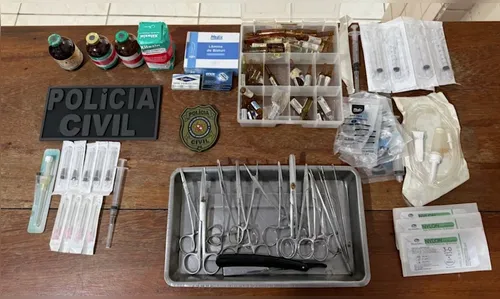 Durante a ação policial, foram apreendidos diversos materiais de uso veterinário, como medicamentos sedativos, analgésicos e miorrelaxantes, além de pinças cirúrgicas, lâminas de bisturi, equipos de infusão venosa, fios de sutura, seringas e agulhas, reforçando a suspeita da prática ilegal.