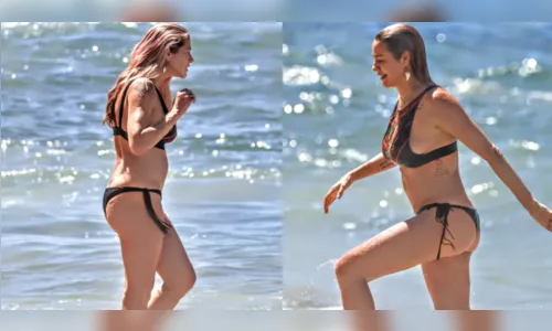 Para o dia à beira-mar, a atriz apostou em um biquíni cropped preto com estampas coloridas, complementado por acessórios chamativos, como brincos com penduricalhos e um boné rosa. Ao sair do mar, foi vista observando o movimento na areia, exibindo naturalidade e boa forma.