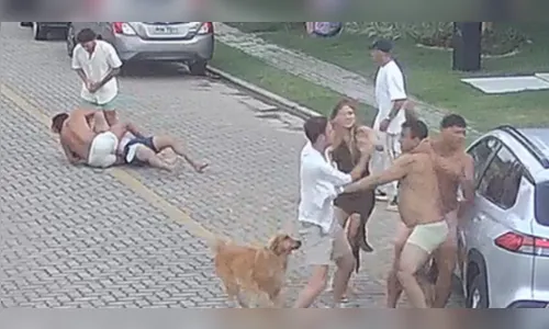 Nas imagens, além dos jogadores, aparecem outros quatro homens e duas mulheres. Algumas pessoas utilizam cadeiras durante a confusão, enquanto um cachorro também aparece no local, circulando entre os envolvidos.