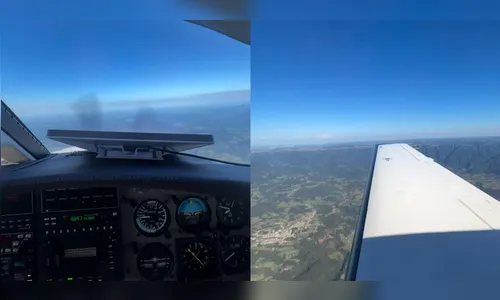 Na publicação de Renan Saes, é possível ver imagens da vista aérea do avião. Nos registros, a aeronave sobrevoa uma região de montanhas e mais ao fundo pode-se avistar parques eólicos.