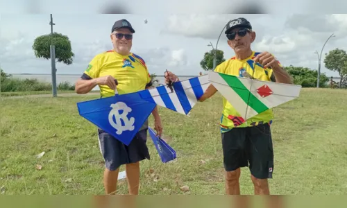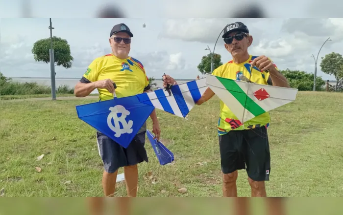 No encontro, empinadores de papagaios e cangulas se desafiam com os "brinquedos de papel e talas" com cores e escudos de Remo e Paysandu.