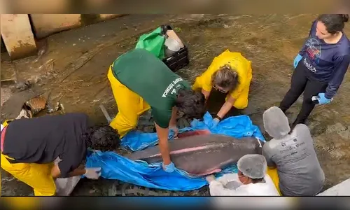 O animal ficou preso no canal e rapidamente virou motivo de curiosidade para quem passava pelo local. Vídeos e fotos foram registrados por populares, que acompanharam a movimentação do boto na água.