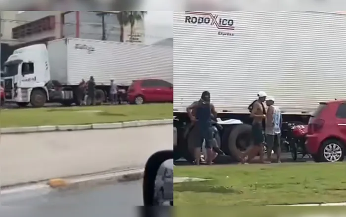 Imagens compartilhadas nas redes sociais mostram parte da situação logo após o acidente. Nos registros, é possível ver um carro de passeio trafegando na contramão, um motociclista caído no chão e, ao lado, um caminhão parado na pista.