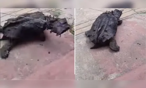 Em um vídeo que circula nas redes sociais, é possível ver a tartaruga com uma corda amarrada no pescoço, sendo puxada enquanto várias pessoas observam a cena ao redor.