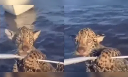 O felino, visivelmente exausto, agarra-se ao equipamento e é retirado da água com segurança. Segundo relatos, a mãe da onça havia sido vista anteriormente na região onde o filhote foi deixado.